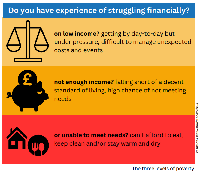 - with personal experience of struggling against poverty / financial insecurity
